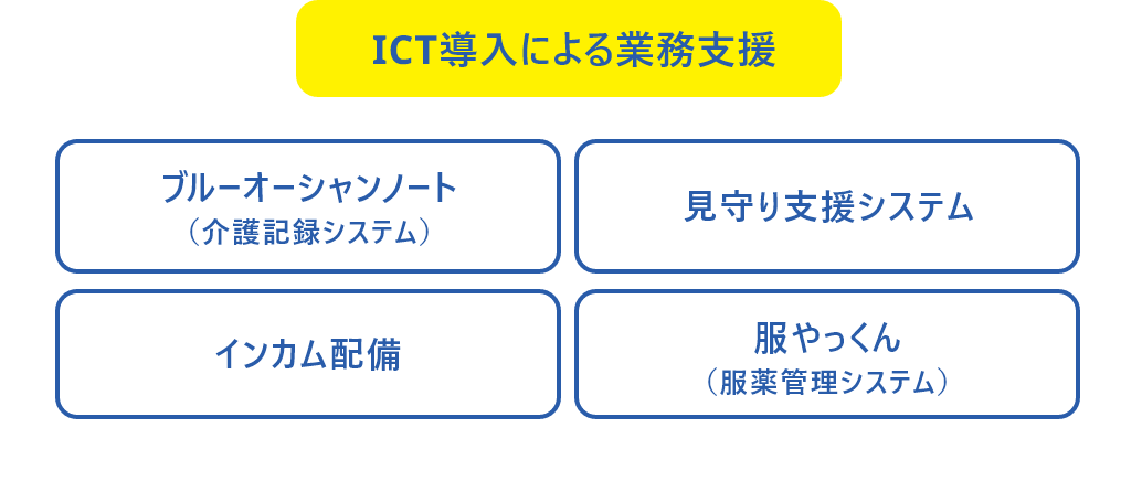 見守り支援システムにより 夜間帯の見回り業務の負担を軽減しています。 またALSOKグループならではの 万全のセキュリティが全施設に完備。 夜間でも安心して業務に集中できます。